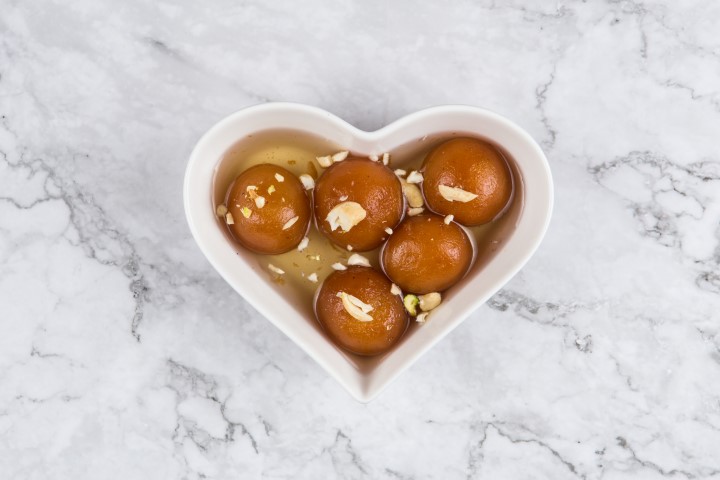 A popular Indian dessert made with khoya (a type of milk solids), flour, and sugar syrup. The dough is shaped into small balls and deep-fried until golden brown. These fried balls are then soaked in a warm sugar syrup flavored with cardamom and rosewater, making them soft and sweet.
