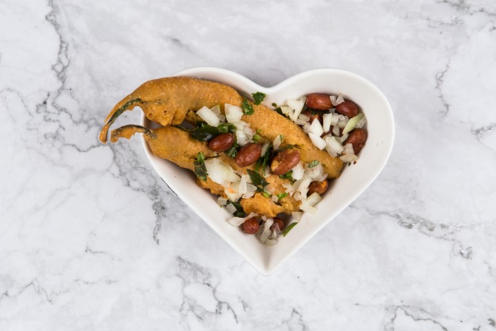 A popular Indian street food snack made with green chilies that are slit, stuffed with a spiced potato mixture, and dipped in a batter made with chickpea flour before being deep-fried until golden and crispy.